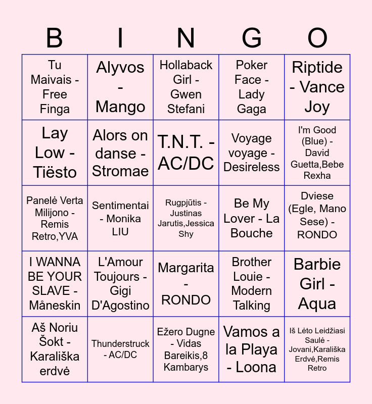 This bingo card has 105 words: Bella Ciao - Becky G, Bad guy - Billie Eilish, Riptide - Vance Joy, Can't Hold Us - Macklemore & Ryan Lewis, Without Me - Eminem, Roses - SAINt JHN,Imanbek, I Took A Pill In Ibiza - Mike Posner,Seeb, Last Christmas - Wham!, Flowers - Miley Cyrus, Everybody (Backstreet's Back) - Backstreet Boys, The Rhythm of the Night - Corona, Sweet Dreams - Eurythmics,Annie Lennox,Dave Stewart, FREE, Hey Ya! - Outkast, SexyBack - Justin Timberlake,Timbaland, In Da Club - 50 Cent, Hollaback Girl - Gwen Stefani, Oops! I Did It Again - Britney Spears, Ice Ice Baby - Vanilla Ice, The Real Slim Shady - Eminem, Butterfly - Crazy Town, Smells Like Teen Spirit - Nirvana, Take on Me - a-ha, Girls Just Want to Have Fun - Cyndi Lauper, Makeba - Jain,Ian Asher, L'Amour Toujours - Gigi D'Agostino, I'm Good (Blue) - David Guetta,Bebe Rexha, Poker Face - Lady Gaga, Tokyo Drift - Teriyaki Boyz, Stayin Alive - Bee Gees, Brother Louie - Modern Talking, Vamos a la Playa - Loona, Tacata- Tacabro, Dance Monkey - Tones And I, Billie Jean - Michael Jackson, Don't Stop Me Now - Queen, Another One Bites The Dust - Queen, It's My Life - Bon Jovi, T.N.T. - AC/DC, Thunderstruck - AC/DC, ZITTI E BUONI - Måneskin, I WANNA BE YOUR SLAVE - Måneskin, I Was Made For Lovin' You - KISS, Lay Low - Tiësto, Sindikato Smogikai - G&G Sindikatas, Tu Maivais - Free Finga, Kevinas Durantas - OG Version, Rugpjūtis - Justinas Jarutis,Jessica Shy, Kunigunda - Vaidas Baumila, Iš Lėto Leidžiasi Saulė - Jovani,Karališka Erdvė,Remis Retro, Tavo Svajonė - Andrius Mamontovas, Nebenoriu Laukt - Džordana Butkutė, Juoda Orchidėja - MG INTERNATIONAL, Melodramos - Rokas Yan,Evgenya Redko, Tyliai Pakuždėk - Jessica Shy,Nombeko Auguste, Važiuoju Kur Širdis - GJan, Dūšia - Leon Somov,Monika Linkyte, Norim Šokti - Saulius Prūsaitis, Trys Milijonai - Marijonas Mikutavičius, Margarita - RONDO, Dviese (Egle, Mano Sese) - RONDO, Vienas Namuose - Džordana Butkutė, Kai sirpsta vyšnios Suvalkijoj - Vytautas Kernagis, Lūpytės - Baltasis Kiras, Velniškas Greitis - 69 Danguje, Jei Leisi - Gabrielius Vagelis,69 Danguje, Vėjai - Gabrielius Vagelis, Alyvos - Mango, Panelė Verta Milijono - Remis Retro,YVA, Sentimentai - Monika LIU, Ežero Dugne - Vidas Bareikis,8 Kambarys, Sel 600 - Sel, Žalia Sierra - DJ Dalgis, Tu Privalai Skambėt - Lilas ir Innomine, Vėl Švieski - Stasys Povilaitis, A Song to Live - Beissoul & Einius, Nervai - Vidas Bareikis, Truputį Laimės - Kastaneda, Aš Noriu Šokt - Karališka erdvė, Discoteque - THE ROOP, Danza Kuduro - Lucenzo,Don Omar, Relax, Take It Easy - MIKA, What Is Love - Haddaway, Alors on danse - Stromae, Only Girl - Rihanna, Be My Lover - La Bouche, Rhythm Is a Dancer - SNAP!, Macarena - Los Del Rio, (I Just) Died In Your Arms - Cutting Crew, U Can't Touch This - MC Hammer, Yeah! - USHER,Lil Jon,Ludacris, Never Gonna Give You Up - Rick Astley, Ką Daryt? - Radži, Robinzonas - Vitalija Katunskytė, Barbie Girl - Aqua, Eye of the Tiger - Survivor, Moi... Lolita - Alizée, Thunder - Imagine Dragons, Voyage voyage - Desireless, Pump Up The Jam - Technotronic, Umbrella - Rihanna,JAY-Z, Gasolina - Daddy Yankee, Super Freak - Rick James, test and test2.