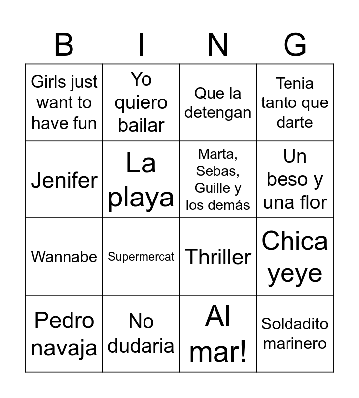 This bingo card has 67 words: Mi burrito sabanero, El Radabà, Boig per tu, Me colé en una fiesta, I want to break free, Paraules d'amor, Yo quiero bailar, Antes muerta que sencilla, Un beso y una flor, Amante bandido, La patata, Por la raja de tu falda, Al mar!, Jenifer, La flaca, La playa, Chica yeye, Girls just want to have fun, Dancing queen, Wannabe, Baby one more time, Soldadito marinero, Tenia tanto que darte, Besos, Como camarón, La revolución sexual, Ave María, La marina està morena, Supermercat, Tobogan, Pedro navaja, Chiquitita, Se acabó, L'estaca, Qualsevol nit pot sortir el sol, Fum, fum, fum, YMCA, Sweet Caroline, Thriller, La bomba, Mambo no.5, Marta, Sebas, Guille y los demás, No dudaria, Como una ola, Roxanne, Los peces en el río, El muerto vivo, Coti x coti, Devuélveme a mi chica, Milionària, Que la detengan, Mamma mia, Aserejé, A quién le importa, Ay mamá, Bon dia, Carolina, Hay que venir al sur, Escándalo, Cuando tú vas, Al vent, Mi gran noche, Malamente, Super Fashion, Bailoteo, Rosas and Puedes contar conmigo.