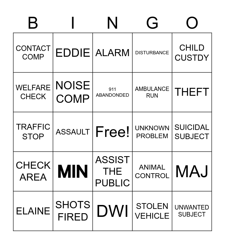 This bingo card has a free space and 24 words: MIN, SHOTS FIRED, 911 ABANDONDED, ELAINE, CHILD CUSTDY, CONTACT COMP, WELFARE CHECK, EDDIE, UNKNOWN PROBLEM, ASSIST THE PUBLIC, AMBULANCE RUN, TRAFFIC STOP, ANIMAL CONTROL, MAJ, NOISE COMP, STOLEN VEHICLE, SUICIDAL SUBJECT, ALARM, THEFT, ASSAULT, UNWANTED SUBJECT, CHECK AREA, DISTURBANCE and DWI.