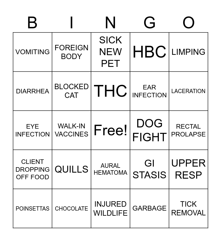 This bingo card has a free space and 24 words: QUILLS, CHOCOLATE, THC, POINSETTAS, LIMPING, VOMITING, DIARRHEA, FOREIGN BODY, DOG FIGHT, AURAL HEMATOMA, EAR INFECTION, EYE INFECTION, GI STASIS, UPPER RESP, BLOCKED CAT, GARBAGE, RECTAL PROLAPSE, SICK NEW PET, LACERATION, WALK-IN VACCINES, TICK REMOVAL, CLIENT DROPPING OFF FOOD, HBC and INJURED WILDLIFE.