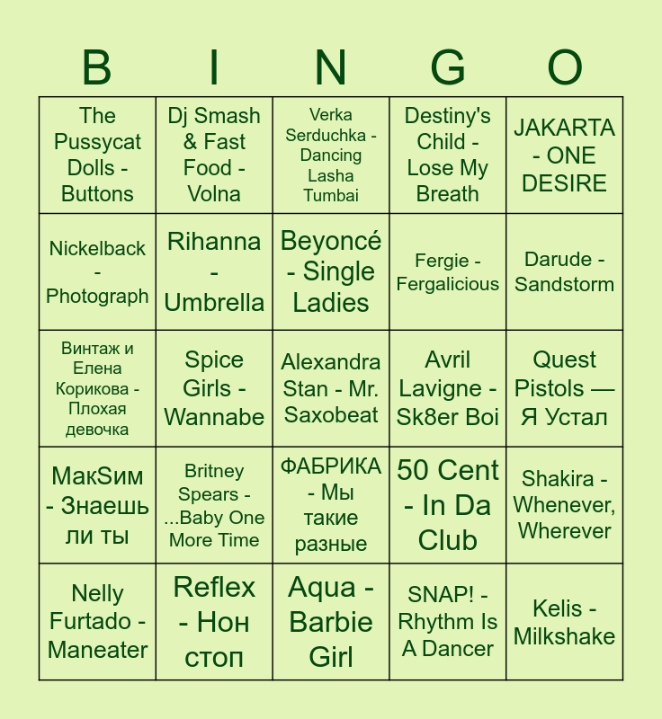 This bingo card has 51 words: Free!, Alexandra Stan - Mr. Saxobeat, Bomfunk MC's - Freestyler, Aqua - Barbie Girl, Britney Spears - ...Baby One More Time, Cascada - Everytime We Touch, Dj Smash & Fast Food - Volna, Foo Fighters - The Pretender, Nickelback - Photograph, Eminem - Lose Yourself, Rihanna - Umbrella, Destiny's Child - Lose My Breath, Shakira - Whenever, Wherever, 50 Cent - In Da Club, System Of A Down - Chop Suey, Justin Timberlake - SexyBack, Beyoncé - Single Ladies, Avril Lavigne - Sk8er Boi, Benny Benassi - Satisfaction, JAKARTA - ONE DESIRE, Spice Girls - Wannabe, SNAP! - Rhythm Is A Dancer, The Pussycat Dolls - Buttons, Fergie - Fergalicious, Günther - Ding Dong Song, Kelis - Milkshake, Darude - Sandstorm, Lady Gaga - Poker Face, Nelly Furtado - Maneater, Verka Serduchka - Dancing Lasha Tumbai, t.A.T.u. - Нас не догонят, Katy Perry - I Kissed A Girl, Nena - 99 Luftballons, Technotronic - Pump Up The Jam, Серега - Черный бумер, Reflex - Нон стоп, Валерий Меладзе - Текила любовь, 5'nizza- Ямайка, Блестящие и Arash - Восточные сказки, Виа Гра - Биология, Quest Pistols — Я Устал, МакSим - Знаешь ли ты, БандЭрос - Бум Сеньорита, Банда - Плачут небеса, Киркоров & Распутина - Роза Чайная, БЬЯНКА - Были танцы, Винтаж и Елена Корикова - Плохая девочка, Лолита - Ориентация север, СЛОТ – Мертвые звезды, ФАБРИКА - Мы такие разные and Звери - Районы-кварталы.