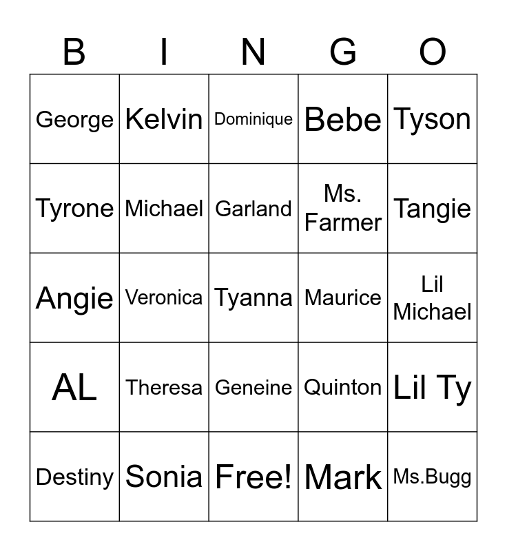 This bingo card has 25 words: AL, Sonia, Tyanna, Mark, Tyson, George, Kelvin, Dominique, Maurice, Lil Ty, Tyrone, Michael, Free!, Quinton, Tangie, Destiny, Veronica, Garland, Ms. Farmer, Lil Michael, Angie, Theresa, Geneine, Bebe and Ms.Bugg.