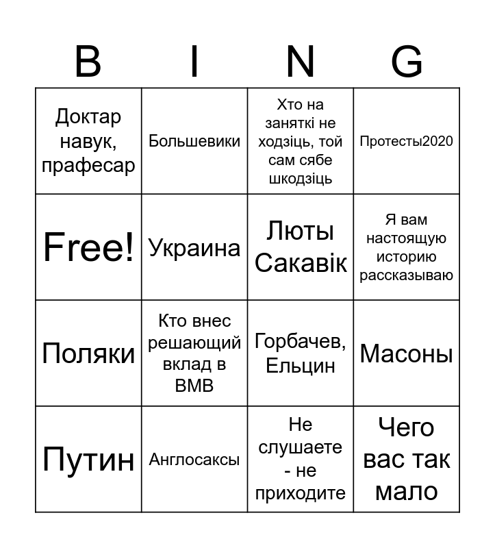This bingo card has 16 words: Англосаксы, Масоны, Хто на заняткi не ходзiць, той сам сябе шкодзiць, Доктар навук, прафесар, Поляки, Большевики, Горбачев, Ельцин, Не слушаете - не приходите, Free!, Украина, Путин, Протесты2020, Кто внес решающий вклад в ВМВ, Я вам настоящую историю рассказываю, Люты Сакавiк and Чего вас так мало.