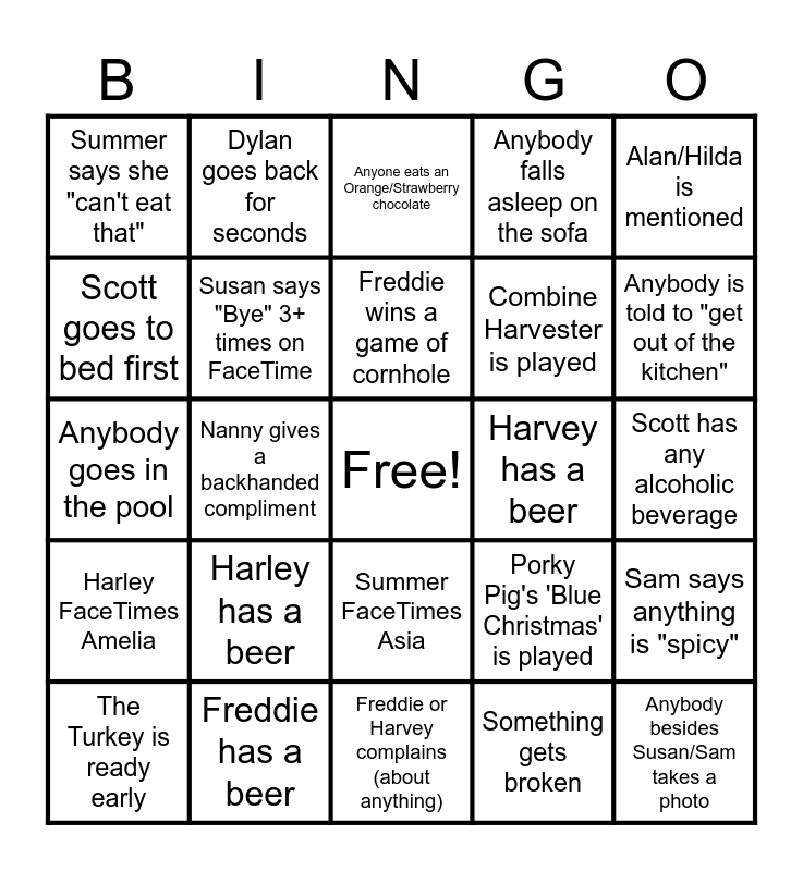 This bingo card has a free space and 29 words: The Turkey is ready early, Something is missing from Xmas dinner, Nanny gives a backhanded compliment, Scott complains about a minor injury, Summer says she "can't eat that", Anyone eats an Orange/Strawberry chocolate, Susan says "Bye" 3+ times on FaceTime, Harley has a beer, Harvey has a beer, Freddie has a beer, Scott has any alcoholic beverage, Anybody besides Susan/Sam takes a photo, Freddie or Harvey complains (about anything), Something gets broken, Anybody is told to "get out of the kitchen", Dylan plays a heavy metal song, Summer FaceTimes Asia, Harley FaceTimes Amelia, Alan/Hilda is mentioned, Anybody goes in the pool, Porky Pig's 'Blue Christmas' is played, Rattling Bog is played, Combine Harvester is played, Scott goes to bed first, Anybody falls asleep on the sofa, Dylan goes back for seconds, Sam says anything is "spicy", Freddie wins a game of cornhole and Harvey likes the sprouts.