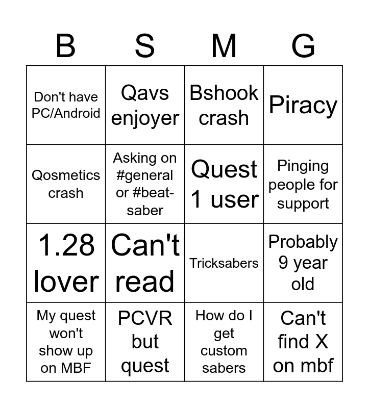 This bingo card has 16 words: PCVR but quest, Probably 9 year old, Bshook crash, Don't have PC/Android, 1.28 lover, Qavs enjoyer, Tricksabers, How do I get custom sabers, Qosmetics crash, Asking on #general or #beat-saber, My quest won't show up on MBF, Piracy, Can't read, Pinging people for support, Quest 1 user and Can't find X on mbf.