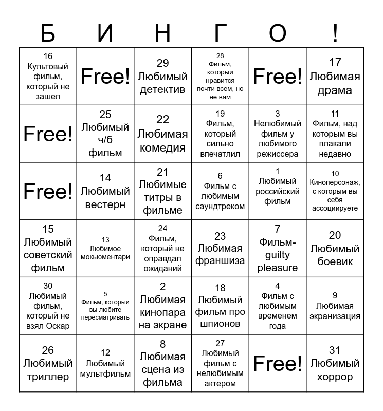 This bingo card has 36 words: 18 Любимый фильм про шпионов, 2 Любимая кинопара на экране, 27 Любимый фильм с нелюбимым актером, Free!, 15 Любимый советский фильм, 6 Фильм с любимым саундтреком, 25 Любимый ч/б фильм, 8 Любимая сцена из фильма, Free!, 4 Фильм с любимым временем года, 11 Фильм, над которым вы плакали недавно, 28 Фильм, который нравится почти всем, но не вам, 9 Любимая экранизация, 14 Любимый вестерн, 19 Фильм, который сильно впечатлил, 16 Культовый фильм, который не зашел, 30 Любимый фильм, который не взял Оскар, 1 Любимый российский фильм, Free!, 29 Любимый детектив, 21 Любимые титры в фильме, 13 Любимое мокьюментари, 23 Любимая франшиза, 24 Фильм, который не оправдал ожиданий, 7 Фильм-guilty pleasure, Free!, 3 Нелюбимый фильм у любимого режиссера, 12 Любимый мультфильм, 22 Любимая комедия, 17 Любимая драма, 31 Любимый хоррор, 26 Любимый триллер, 20 Любимый боевик, 10 Киноперсонаж, с которым вы себя ассоциируете, 5 Фильм, который вы любите пересматривать and Free!.