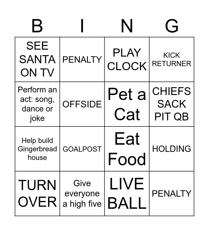 This bingo card has 25 words: BUTKER MAKES FIELD GOAL, FUMBLE, CHIEFS SACK PIT QB, Chiefs score TD, Perform an act: song, dance or joke, SEE SANTA ON TV, OFFSIDE, PENALTY, Give everyone a high five, Kelsey catches football, Help build Gingerbread house, Eat Food, Turnover, SCREEN PASS, Pet a Cat, OFFICIALS, LIVE BALL, PLAY CLOCK, GOALPOST, HOLDING, TURN OVER, OPEN RECEIVER, PENALTY, KICK RETURNER and SPIRAL.