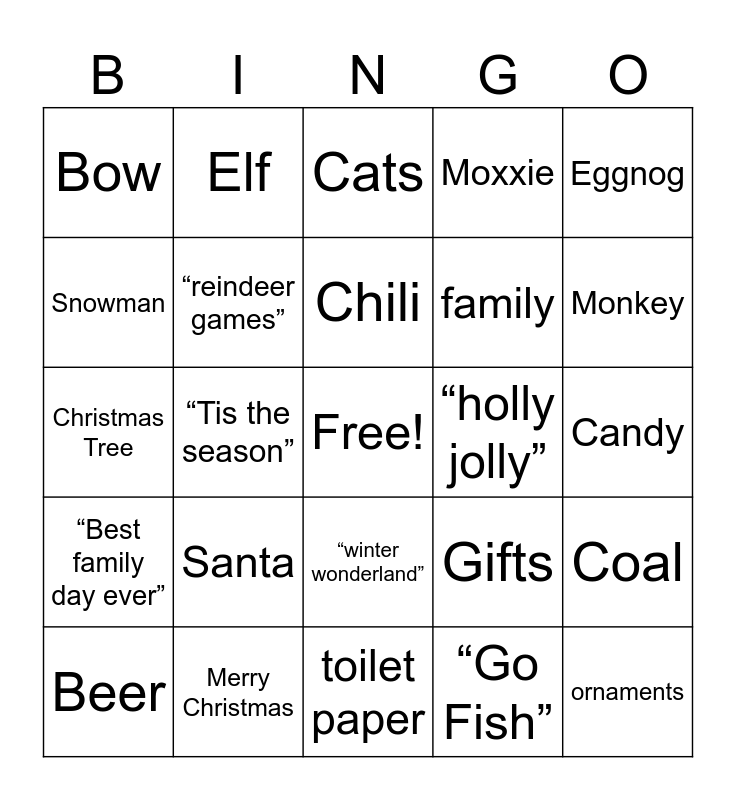This bingo card has a free space and 24 words: Santa, Merry Christmas, Chili, Beer, Eggnog, Bow, Snowman, Elf, “holly jolly”, “winter wonderland”, family, Christmas Tree, Gifts, Coal, “reindeer games”, “Go Fish”, Candy, Cats, Monkey, “Tis the season”, ornaments, “Best family day ever”, Moxxie and toilet paper.