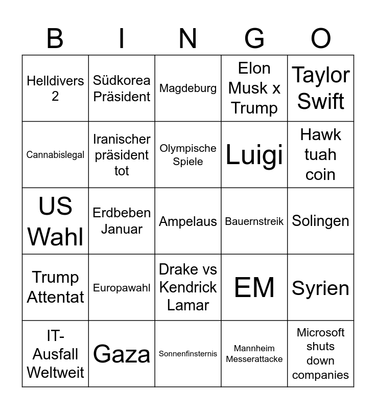 This bingo card has a free space and 24 words: Europawahl, Gaza, Olympische Spiele, IT-Ausfall Weltweit, Taylor Swift, Helldivers 2, Cannabislegal, Südkorea Präsident, Bauernstreik, Drake vs Kendrick Lamar, Luigi, US Wahl, EM, Syrien, Iranischer präsident tot, Mannheim Messerattacke, Solingen, Magdeburg, Hawk tuah coin, Erdbeben Januar, Microsoft shuts down companies, Trump Attentat, Elon Musk x Trump and Sonnenfinsternis.