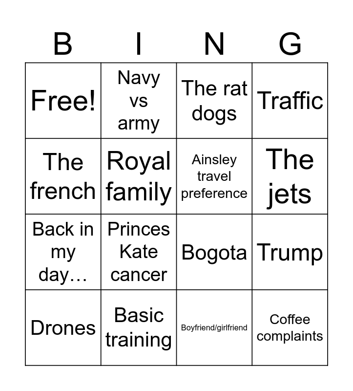This bingo card has 16 words: Drones, Basic training, The rat dogs, Traffic, The french, Navy vs army, Bogota, Trump, Free!, Royal family, Boyfriend/girlfriend, The jets, Back in my day…, Princes Kate cancer, Ainsley travel preference and Coffee complaints.