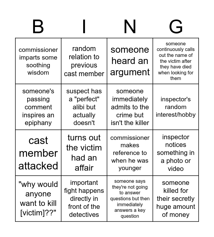 This bingo card has 33 words: "are you saying [victim] was murdered??", "if you're suggesting i killed [victim] [...]", inspector notices something in a photo or video, darlene suddenly has new information, someone killed for their secretly huge amount of money, someone immediately admits to the crime but isn't the killer, someone's passing comment inspires an epiphany, fake identity, random relation to previous cast member, rhetorical question, inspector's random interest/hobby, someone heard an argument, inspector finds randomly important item on corpse, chase scene, important fight happens directly in front of the detectives, turns out the victim had an affair, commissioner tells inspector to get the case done quickly, commissioner makes reference to when he was younger, random scene of someone stealing something to make them more suspicious, "none of this makes any sense", "it couldn't have been any of us", murder actually happened at an earlier/later time than everyone thought, commissioner imparts some soothing wisdom, someone says they're not going to answer questions but then immediately answers a key question, the other officers make fun of the inspector, "why would anyone want to kill [victim]??", someone continuously calls out the name of the victim after they have died when looking for them, cast member attacked, suspect has a "perfect" alibi but actually doesn't, someone finishes someone else's sentence, suspicious phone call, hospital scene and unexpected appearance of cast member's relative.