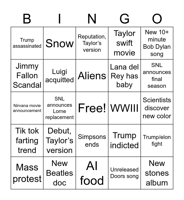This bingo card has a free space and 24 words: Debut, Taylor’s version, New Beatles doc, Aliens, Mass protest, New 10+ minute Bob Dylan song, Trump assassinated, Jimmy Fallon Scandal, Snow, WWIII, Simpsons ends, Lana del Rey has baby, Nirvana movie announcement, Trump indicted, Trump/elon fight, Luigi acquitted, Unreleased Doors song, Scientists discover new color, Reputation, Taylor’s version, SNL announces final season, SNL announces Lorne replacement, New stones album, Tik tok farting trend, Taylor swift movie and AI food.