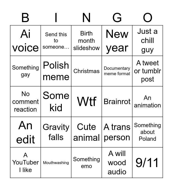 This bingo card has a free space and 24 words: Gravity falls, Mouthwashing, Christmas, A YouTuber I like, Just a chill guy, Ai voice, Something gay, Send this to someone…, Brainrot, Cute animal, Documentary meme format, No comment reaction, A trans person, Something about Poland, Polish meme, A will wood audio, An animation, Birth month slideshow, A tweet or tumblr post, Some kid, 9/11, An edit, New year and Something emo.