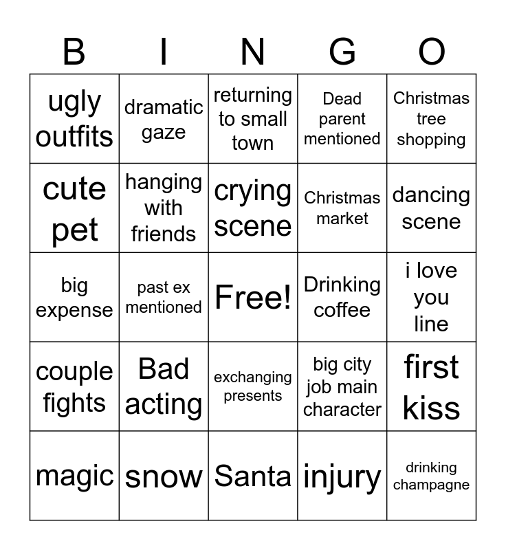 This bingo card has a free space and 24 words: Bad acting, snow, crying scene, magic, Christmas tree shopping, ugly outfits, cute pet, dramatic gaze, Drinking coffee, exchanging presents, Christmas market, big expense, big city job main character, first kiss, hanging with friends, injury, i love you line, returning to small town, dancing scene, past ex mentioned, drinking champagne, couple fights, Dead parent mentioned and Santa.