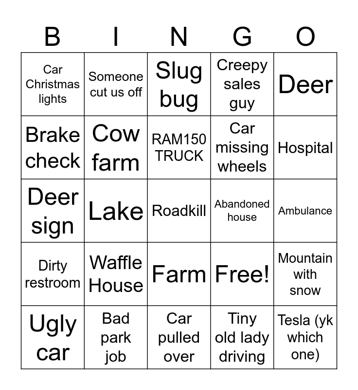 This bingo card has 25 words: Waffle House, Car pulled over, RAM150 TRUCK, Ugly car, Deer, Car Christmas lights, Brake check, Someone cut us off, Abandoned house, Farm, Car missing wheels, Deer sign, Free!, Mountain with snow, Cow farm, Tesla (yk which one), Ambulance, Slug bug, Hospital, Lake, Roadkill, Bad park job, Dirty restroom, Creepy sales guy and Tiny old lady driving.
