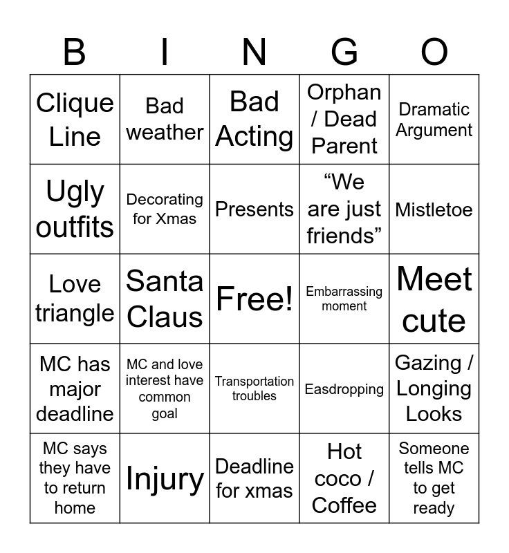 This bingo card has a free space and 24 words: MC says they have to return home, MC and love interest have common goal, Presents, Hot coco / Coffee, Dramatic Argument, Clique Line, Bad weather, Bad Acting, Embarrassing moment, Meet cute, Love triangle, Decorating for Xmas, Easdropping, Gazing / Longing Looks, Ugly outfits, Injury, Deadline for xmas, Orphan / Dead Parent, Mistletoe, MC has major deadline, Santa Claus, Transportation troubles, “We are just friends” and Someone tells MC to get ready.