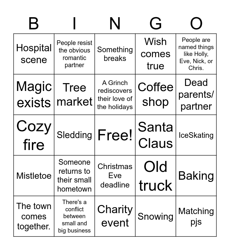 This bingo card has a free space and 24 words: Someone returns to their small hometown, There's a conflict between small and big business, A Grinch rediscovers their love of the holidays, The town comes together., People are named things like Holly, Eve, Nick, or Chris., Hospital scene, Magic exists, People resist the obvious romantic partner, Santa Claus, Christmas Eve deadline, Coffee shop, Cozy fire, Old truck, Baking, Tree market, Snowing, IceSkating, Something breaks, Dead parents/ partner, Sledding, Matching pjs, Mistletoe, Wish comes true and Charity event.