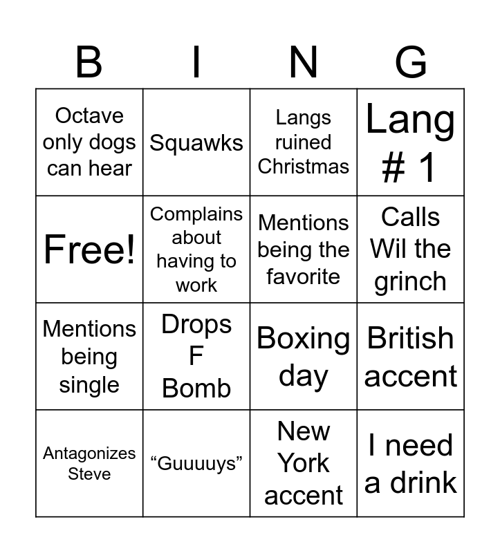 This bingo card has 16 words: “Guuuuys”, British accent, Langs ruined Christmas, Octave only dogs can hear, Mentions being single, Squawks, Boxing day, New York accent, Free!, Complains about having to work, Antagonizes Steve, Lang # 1, Drops F Bomb, Calls Wil the grinch, Mentions being the favorite and I need a drink.