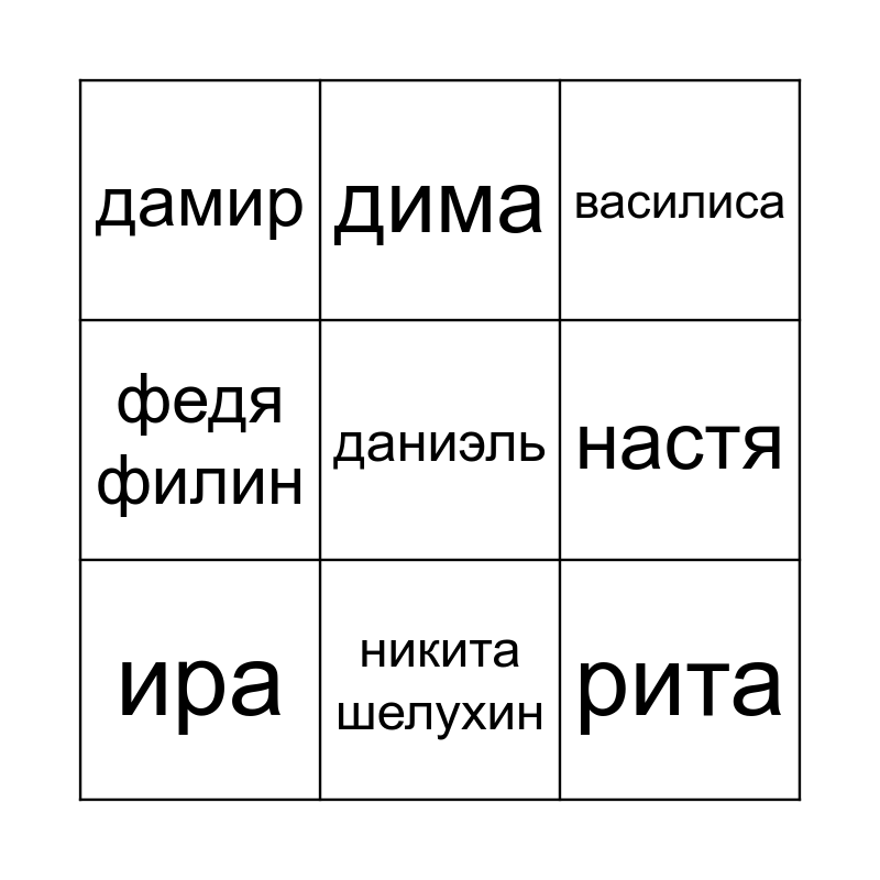 This bingo card has 9 words: ира, василиса, дима, федя филин, дамир, настя, даниэль, рита and никита шелухин.