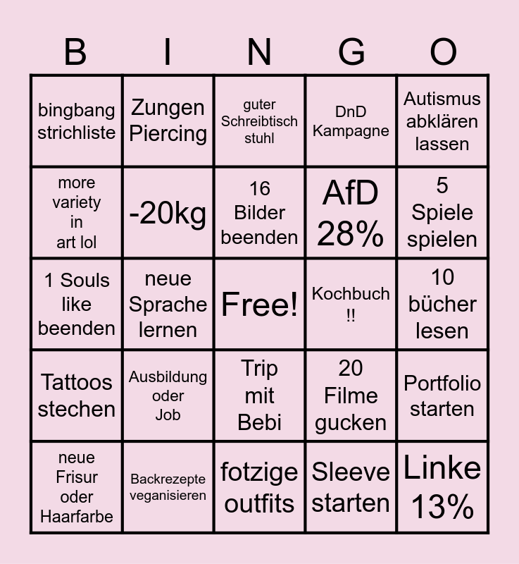 This bingo card has a free space and 24 words: Ausbildung oder Job, Backrezepte veganisieren, 16 Bilder beenden, neue Frisur oder Haarfarbe, Autismus abklären lassen, bingbang strichliste, more variety in art lol, Zungen Piercing, Kochbuch !!, Trip mit Bebi, AfD 28%, 1 Souls like beenden, 20 Filme gucken, Portfolio starten, -20kg, Sleeve starten, 10 bücher lesen, guter Schreibtisch stuhl, 5 Spiele spielen, neue Sprache lernen, Linke 13%, Tattoos stechen, DnD Kampagne and fotzige outfits.