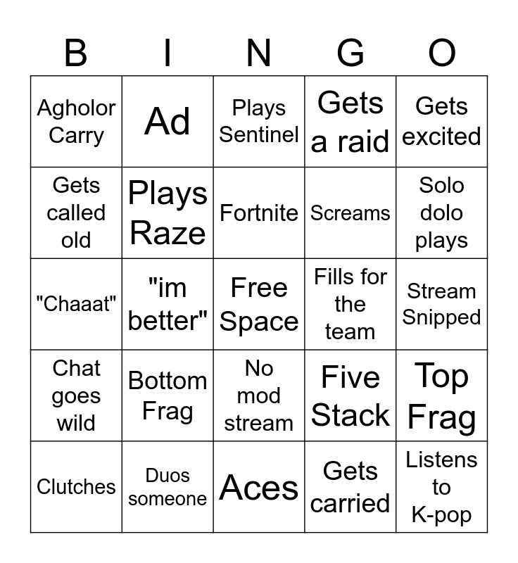 This bingo card has a free space and 38 words: Wins game, Loses game, Duos Rush, Plays Raze, Top Frag, Bottom Frag, Fortnite, Basketball Talk, Gets excited, Screams, "im better", Gets a raid, Listens to K-pop, Stream Snipped, Gets called old, Chat goes wild, Duo command is wrong, Plays Sentinel, Plays Smokes, Fills for the team, Agholor Carry, Duos someone, Solo dolo plays, Clutches, GGs, Aces, Winnie the Pooh, Karaoke, Listens to Katy Perry, Dance time, Plays another game, No mod stream, Gets carried, Ad, Three stack, Five Stack, "Chaaat" and Orders Food.
