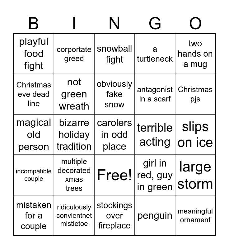 This bingo card has 26 words: Free!, penguin, obviously fake snow, ridiculously convientnet mistletoe, two hands on a mug, playful food fight, Christmas eve dead line, corportate greed, slips on ice, girl in red, guy in green, antagonist in a scarf, magical old person, large storm, mistaken for a couple, bizarre holiday tradition, poinsettias, a turtleneck, incompatible couple, snowball fight, carolers in odd place, Christmas pjs, stockings over fireplace, terrible acting, multiple decorated xmas trees, not green wreath and meaningful ornament.
