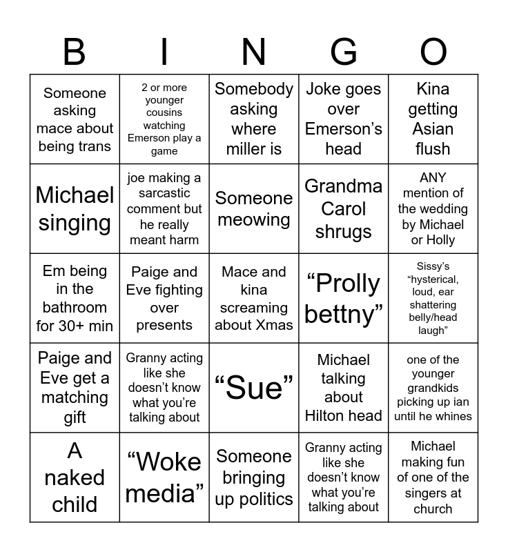 This bingo card has a free space and 25 words: Granny acting like she doesn’t know what you’re talking about, Someone bringing up politics, Someone meowing, A naked child, Kina getting Asian flush, Someone asking mace about being trans, Michael singing, 2 or more younger cousins watching Emerson play a game, “Prolly bettny”, “Sue”, Grandma Carol shrugs, Em being in the bathroom for 30+ min, Michael talking about Hilton head, one of the younger grandkids picking up ian until he whines, joe making a sarcastic comment but he really meant harm, Kina accidentally cussing, Sissy’s “hysterical, loud, ear shattering belly/head laugh”, Somebody asking where miller is, ANY mention of the wedding by Michael or Holly, Paige and Eve fighting over presents, Michael making fun of one of the singers at church, “Woke media”, Paige and Eve get a matching gift, Joke goes over Emerson’s head and Granny acting like she doesn’t know what you’re talking about.