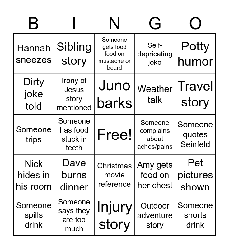 This bingo card has a free space and 29 words: Someone spills drink, Juno freaks out, Someone has food stuck in teeth, Political talk, Hannah sneezes, Someone gets food food on mustache or beard, Irony of Jesus story mentioned, Dave burns dinner, Someone complains about aches/pains, Someone says they ate too much, Someone quotes Seinfeld, Someone snorts drink, Injury story, Outdoor adventure story, Travel story, Childhood story, Christmas movie reference, Nick hides in his room, Potty humor, Someone trips, Amy gets food on her chest, Someone sings Christmas song, Weather talk, Dirty joke told, Self-depricating joke, Sibling story, Pet pictures shown, Juno barks and New years resolution made.