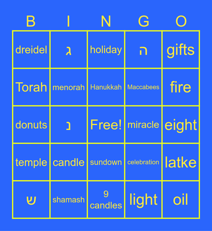 This bingo card has a free space and 24 words: candle, shamash, Hanukkah, ש, gifts, dreidel, Torah, ג, miracle, sundown, Maccabees, donuts, celebration, latke, menorah, light, eight, holiday, fire, נ, oil, temple, ה and 9 candles.
