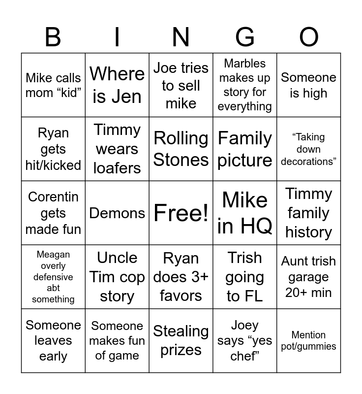 This bingo card has a free space and 24 words: Uncle Tim cop story, Someone makes fun of game, Rolling Stones, Someone leaves early, Someone is high, Mike calls mom “kid”, Ryan gets hit/kicked, Where is Jen, Mike in HQ, Ryan does 3+ favors, Family picture, Corentin gets made fun, Trish going to FL, Aunt trish garage 20+ min, Timmy wears loafers, Joey says “yes chef”, Timmy family history, Joe tries to sell mike, “Taking down decorations”, Demons, Mention pot/gummies, Meagan overly defensive abt something, Marbles makes up story for everything and Stealing prizes.