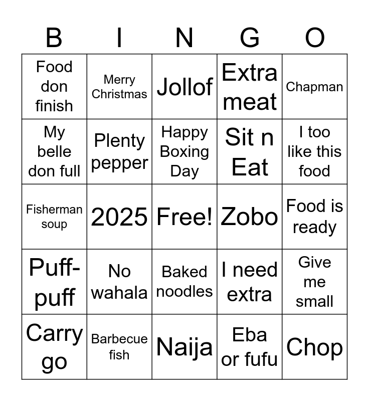 This bingo card has a free space and 29 words: Carry go, Urgent 2k, 2025, Sweet die!, Food don finish, Jollof, Plenty pepper, No wahala, Zobo, Barbecue fish, Food is ready, Chop, Naija, Eba or fufu, I too like this food, Palm wine, Baked noodles, Puff-puff, Chapman, Fisherman soup, I need extra, Ndylicious kitchen, Sit n Eat, My belle don full, Extra meat, Merry Christmas, Give me small, Happy Boxing Day and E no dey.