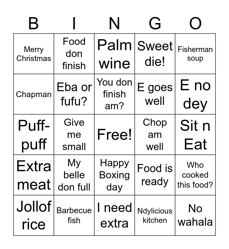 This bingo card has a free space and 29 words: Jollof rice, Plenty pepper, Give me small, Zobo too sweet, Merry Christmas, Palm wine, Eba or fufu?, My belle don full, Chop am well, Barbecue fish, Sit n Eat, No wahala, I need extra, Ndylicious kitchen, E no dey, Naija for life!, Happy Boxing day, Extra meat, Fisherman soup, Puff-puff, Food is ready, I too like this food, E goes well, Chapman, Sweet die!, Food don finish, Who cooked this food?, You don finish am? and Lick hand, wash plate.
