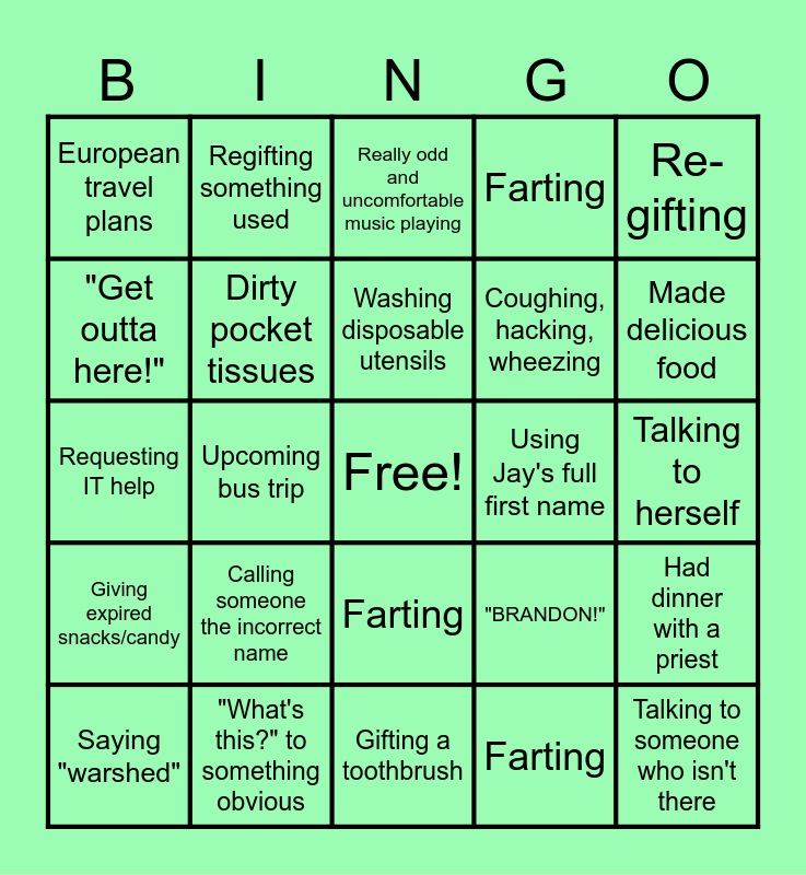 This bingo card has a free space and 24 words: Calling someone the incorrect name, "What's this?" to something obvious, Washing disposable utensils, Saying "warshed", Re-gifting, European travel plans, "Get outta here!", Regifting something used, Using Jay's full first name, Farting, Coughing, hacking, wheezing, Requesting IT help, "BRANDON!", Had dinner with a priest, Dirty pocket tissues, Farting, Talking to herself, Really odd and uncomfortable music playing, Made delicious food, Upcoming bus trip, Talking to someone who isn't there, Giving expired snacks/candy, Farting and Gifting a toothbrush.