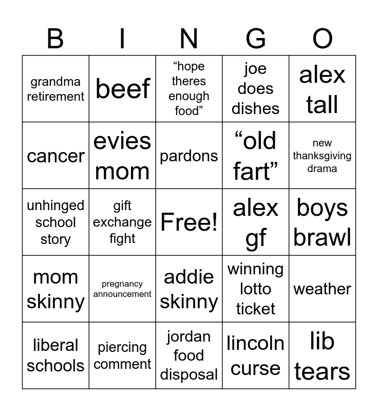 This bingo card has a free space and 24 words: pregnancy announcement, piercing comment, pardons, liberal schools, alex tall, grandma retirement, cancer, beef, alex gf, addie skinny, “old fart”, unhinged school story, winning lotto ticket, weather, evies mom, lincoln curse, boys brawl, “hope theres enough food”, new thanksgiving drama, gift exchange fight, lib tears, mom skinny, joe does dishes and jordan food disposal.