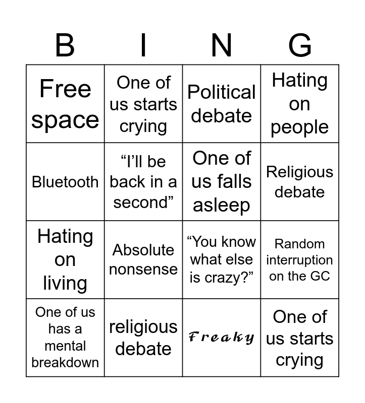 This bingo card has 18 words: Bluetooth, Hating on school, Political debate, Hating on people, Hating on living, One of us starts crying, “You know what else is crazy?”, Religious debate, Free space, Absolute nonsense, 𝓕𝓻𝓮𝓪𝓴𝔂, Random interruption on the GC, One of us has a mental breakdown, “I’ll be back in a second”, One of us falls asleep, Music recommendation, religious debate and One of us starts crying.