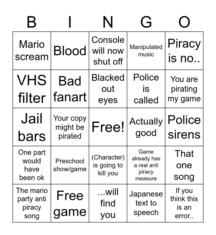 This bingo card has a free space and 24 words: Preschool show/game, Free game, Blacked out eyes, The mario party anti piracy song, Piracy is no.., Mario scream, VHS filter, Blood, Actually good, (Character) is going to kill you, Police is called, Jail bars, Game already has a real anti piracy measure, That one song, Bad fanart, Japanese text to speech, Police sirens, Console will now shut off, You are pirating my game, Your copy might be pirated, If you think this is an error.., One part would have been ok, Manipulated music and ...will find you.