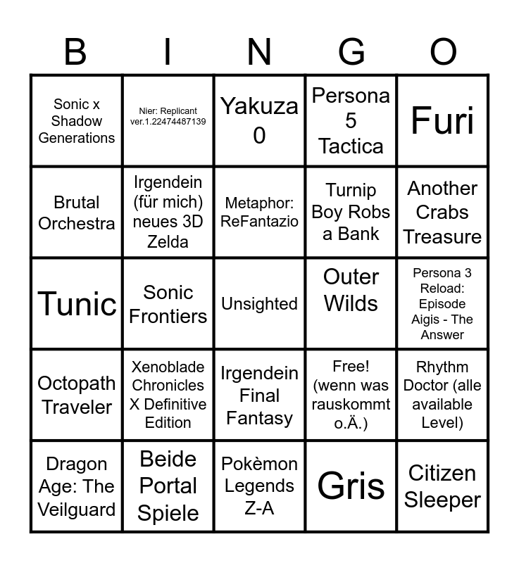 This bingo card has 25 words: Xenoblade Chronicles X Definitive Edition, Pokèmon Legends Z-A, Metaphor: ReFantazio, Dragon Age: The Veilguard, Furi, Sonic x Shadow Generations, Brutal Orchestra, Nier: Replicant ver.1.22474487139, Outer Wilds, Irgendein Final Fantasy, Turnip Boy Robs a Bank, Tunic, Free! (wenn was rauskommt o.Ä.), Rhythm Doctor (alle available Level), Irgendein (für mich) neues 3D Zelda, Citizen Sleeper, Persona 3 Reload: Episode Aigis - The Answer, Yakuza 0, Another Crabs Treasure, Sonic Frontiers, Unsighted, Beide Portal Spiele, Octopath Traveler, Persona 5 Tactica and Gris.