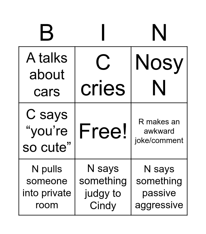 This bingo card has a free space and 8 words: R makes an awkward joke/comment, Nosy N, C cries, N pulls someone into private room, A talks about cars, N says something passive aggressive, C says “you’re so cute” and N says something judgy to Cindy.