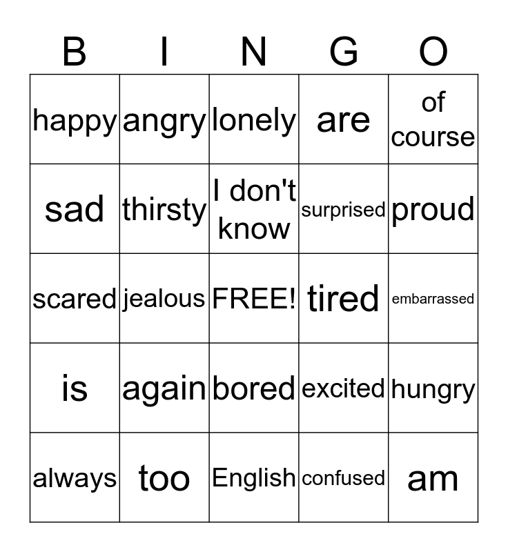 This bingo card has a free space and 24 words: again, too, I don't know, always, of course, happy, sad, angry, tired, bored, surprised, scared, excited, hungry, thirsty, confused, embarrassed, lonely, proud, jealous, am, is, are and English.