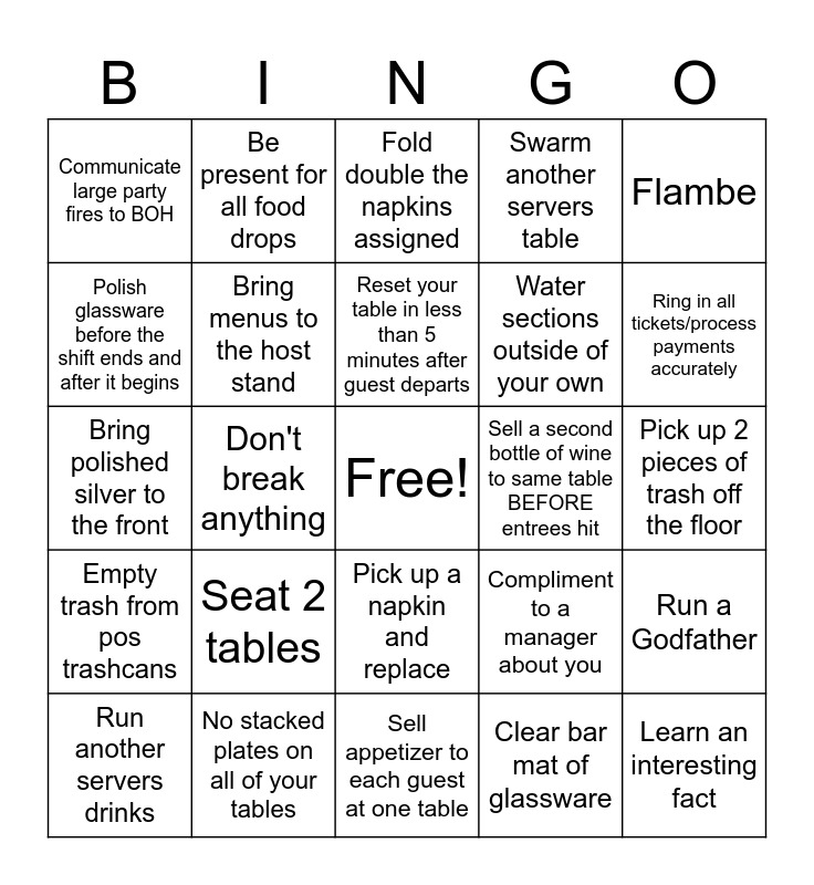This bingo card has a free space and 24 words: Seat 2 tables, No stacked plates on all of your tables, Reset your table in less than 5 minutes after guest departs, Run another servers drinks, Flambe, Communicate large party fires to BOH, Polish glassware before the shift ends and after it begins, Be present for all food drops, Sell a second bottle of wine to same table BEFORE entrees hit, Pick up a napkin and replace, Water sections outside of your own, Bring polished silver to the front, Compliment to a manager about you, Run a Godfather, Bring menus to the host stand, Clear bar mat of glassware, Pick up 2 pieces of trash off the floor, Fold double the napkins assigned, Ring in all tickets/process payments accurately, Don't break anything, Learn an interesting fact, Empty trash from pos trashcans, Swarm another servers table and Sell appetizer to each guest at one table.