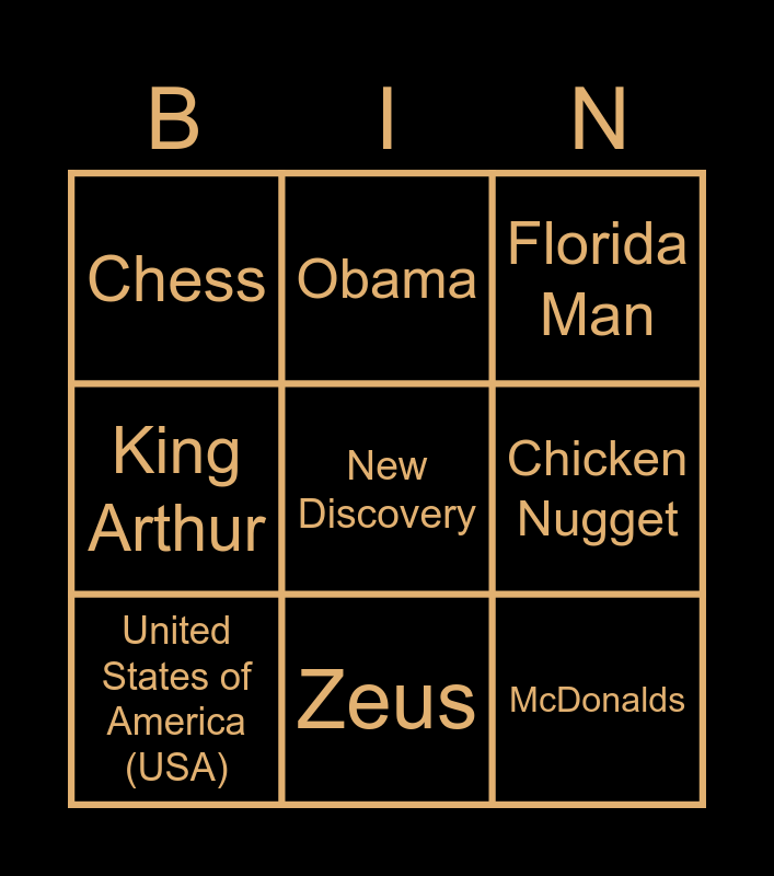 This bingo card has a free space and 8 words: Chicken Nugget, Florida Man, Obama, United States of America (USA), Chess, McDonalds, King Arthur and Zeus.