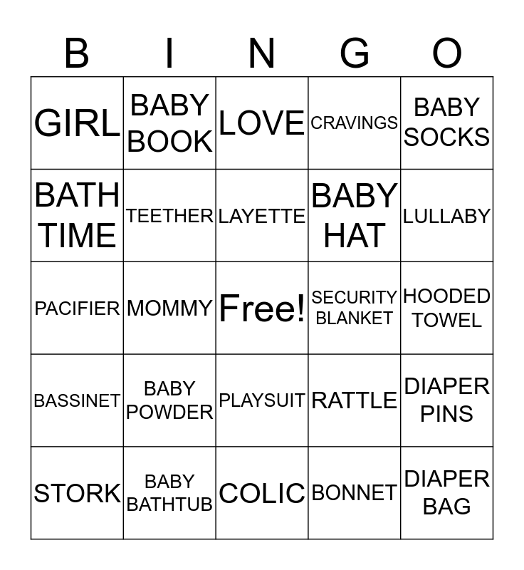 This bingo card has a free space and 81 words: SIPPY CUP, WALKER, LOVE, DIAPERS, BABY SHAMPOO, WASH CLOTH, PINK, ULTRASOUND, BABY CARRIER, MITTENS, NAME, NURSERY RHYME, CRAVINGS, GIRL, NURSERY, BATH TIME, TODDLER, BABY POWDER, BOOTIES, HOODED TOWEL, HIGH CHAIR, BABY SOCKS, PACIFIER, LAYETTE, TEETHER, GRANDDAUGHTER, BURP CLOTH, BABY CARDIGAN, ONESIE, CARRYCOT, LULLABY, CRYING, COLIC, MOBILES, STORK, SECURITY BLANKET, CRADLE, GIFTS, MILK, BABY, DIAPER BAG, STUFFED DOLL, FORMULA, TOWEL, MOMMY, NEWBORN, BABY BOOK, PLAY GYM, BOTTLE, BABY SHIRT, RATTLE, DIAPER PINS, PLAYPEN, WIPES, BIB, GERBER, BLANKIE, SLEEP SACK, MAP TIME, TEETHING RING, PLAYSUIT, RUBBER DUCK, BABY SLING, CLOTHES, BABY FOOD, GIGGLES, FAMILY, BABY MONITOR, BABY LOTION, BABY SWING, TOY BOX, BASSINET, BABY BATHTUB, STROLLER, DAUGHTER, COT, TEDDY BEAR, BONNET, BOUNCEY CHAIR, BABY HAT and BLANKETS.