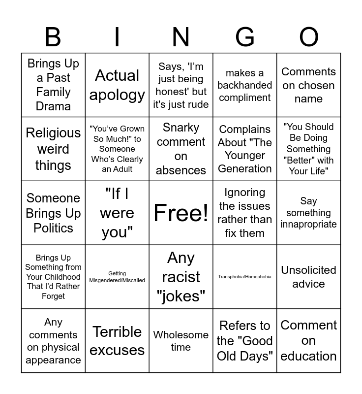 This bingo card has a free space and 24 words: Getting Misgendered/Miscalled, Terrible excuses, Snarky comment on absences, Any comments on physical appearance, Comments on chosen name, Brings Up a Past Family Drama, Religious weird things, Actual apology, Ignoring the issues rather than fix them, Any racist "jokes", Complains About "The Younger Generation, Someone Brings Up Politics, Transphobia/Homophobia, Unsolicited advice, "You’ve Grown So Much!” to Someone Who’s Clearly an Adult, Refers to the "Good Old Days", Say something innapropriate, Says, 'I’m just being honest' but it's just rude, "You Should Be Doing Something "Better" with Your Life", "If I were you", Comment on education, Brings Up Something from Your Childhood That I’d Rather Forget, makes a backhanded compliment and Wholesome time.
