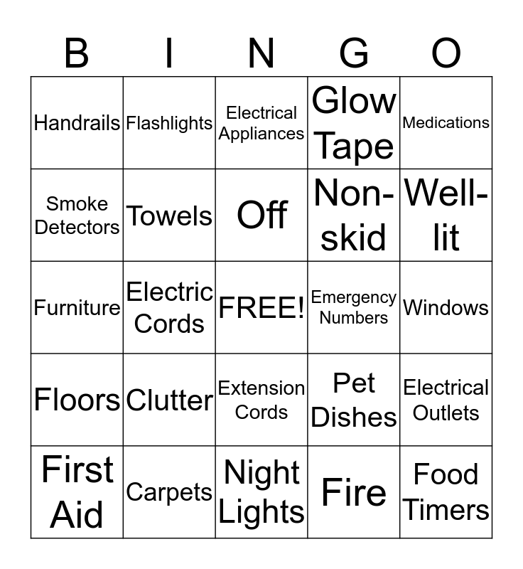 This bingo card has a free space and 24 words: Clutter, Carpets, Off, First Aid, Medications, Handrails, Smoke Detectors, Flashlights, Emergency Numbers, Extension Cords, Non-skid, Furniture, Pet Dishes, Electrical Outlets, Towels, Fire, Windows, Electrical Appliances, Well-lit, Electric Cords, Food Timers, Floors, Glow Tape and Night Lights.