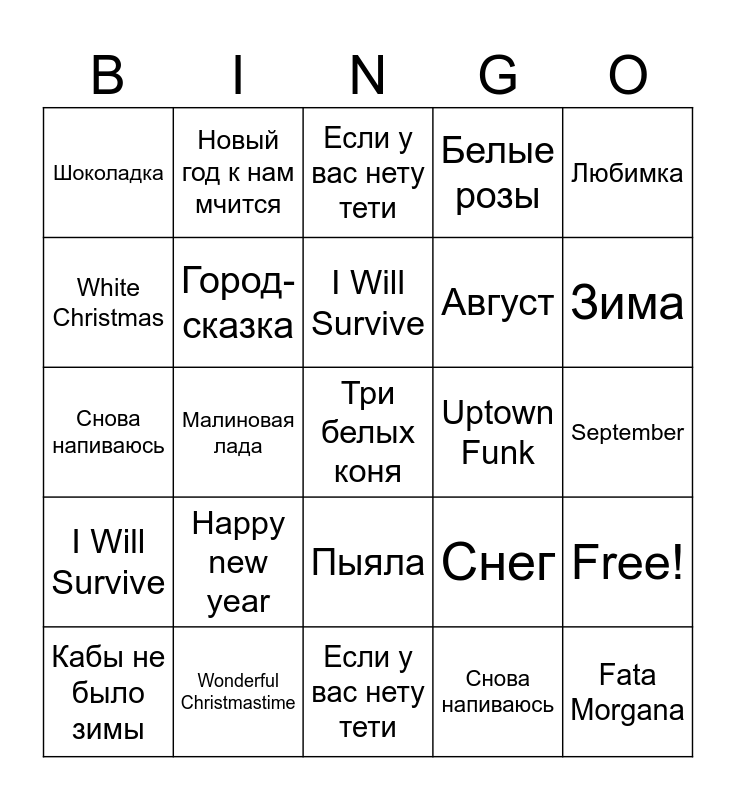 This bingo card has 51 words: Зима, Три белых коня, Кабы не было зимы, Если у вас нету тети, Happy new year, Расскажи снегурочка, Новый год к нам мчится, All I want for X-mass.., White Christmas, Wonderful Christmastime, Город-сказка, Белые розы, Free!, Снег, Dancing Queen, September, I Will Survive, Uptown Funk, Холодно, Любимка, Малиновая лада, Снова напиваюсь, Шоколадка, Август, Пыяла, Fata Morgana, Зима, Три белых коня, Кабы не было зимы, Если у вас нету тети, Happy new year, Расскажи снегурочка, Новый год к нам мчится, All I want for X-mass.., White Christmas, Wonderful Christmastime, Город-сказка, Белые розы, Снег, Dancing Queen, September, I Will Survive, Uptown Funk, Холодно, Любимка, Малиновая лада, Снова напиваюсь, Шоколадка, Август, Пыяла and Fata Morgana.