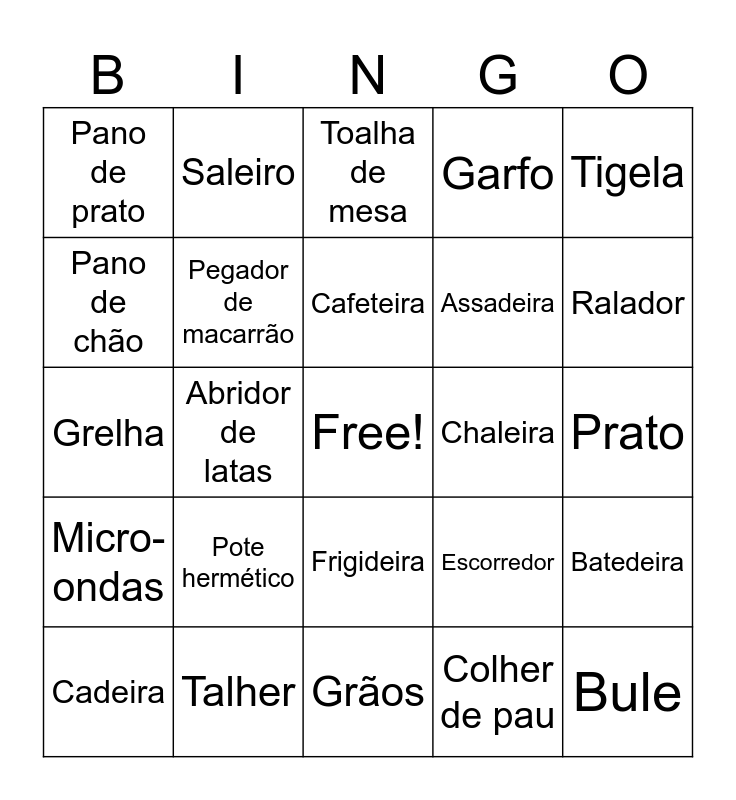 This bingo card has a free space and 70 words: Panela, Prato, Copo, Xícara, Talher, Colher, Garfo, Faca, Tigela, Liquidificador, Batedeira, Coador, Pano de prato, Toalha de mesa, Abridor de garrafa, Abridor de latas, Frigideira, Assadeira, Forno, Micro-ondas, Chaleira, Escorredor, Ralador, Jogo de panelas, Jogo de xícaras, Caneca, Garrafa térmica, Espátula, Colher de pau, Termômetro de cozinha, Saleiro, Pimenteiro, Galheteiro, Tábua de cortar, Pote, Cesto de frutas, Porta-temperos, Rolo de massa, Tigela de vidro, Pano de chão, Escorredor de arroz, Pote hermético, Bule, Vasilha, Coador de café, Pegador de macarrão, Cadeira, Mesa, Cortador de pizza, Timer de cozinha, Pincel de cozinha, Jogo de facas, Forma de bolo, Forma de muffin, Grãos, Fruteira, Cafeteira, Refratário, Escova de limpeza, Suporte de pratos, Grelha, Caderno de receitas, Tesoura de cozinha, Lixeira, Clipes de saco, Vinho, Taça, Frasqueira, Porta-copos and Garrafinha.