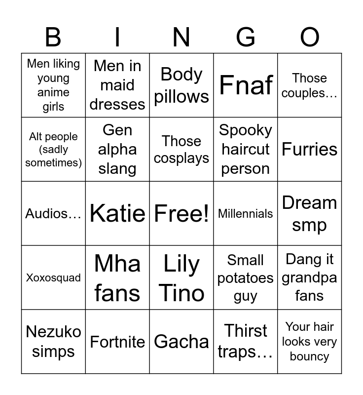 This bingo card has a free space and 24 words: Nezuko simps, Mha fans, Those cosplays, Thirst traps…, Those couples…, Men liking young anime girls, Men in maid dresses, Body pillows, Millennials, Dream smp, Audios…, Gen alpha slang, Small potatoes guy, Dang it grandpa fans, Alt people (sadly sometimes), Fortnite, Gacha, Fnaf, Furries, Xoxosquad, Katie, Lily Tino, Spooky haircut person and Your hair looks very bouncy.