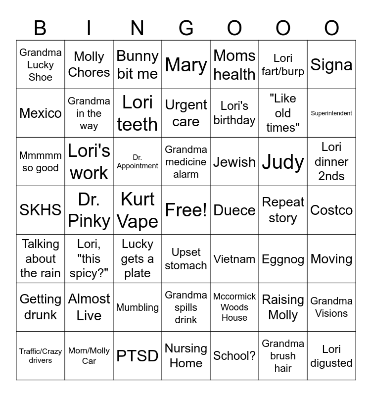 This bingo card has a free space and 48 words: Mccormick Woods House, "Like old times", Nursing Home, Dr. Pinky, Dr. Appointment, Costco, Molly Chores, Mom/Molly Car, Lori fart/burp, Upset stomach, Signa, Mary, Judy, Jewish, Getting drunk, Repeat story, Mexico, Superintendent, Raising Molly, Moms health, Lori's birthday, Kurt Vape, Grandma Lucky Shoe, Grandma in the way, Grandma Visions, Lori teeth, Lori dinner 2nds, Traffic/Crazy drivers, Grandma medicine alarm, Lori's work, Grandma brush hair, Duece, Moving, Almost Live, SKHS, Vietnam, Eggnog, Mmmmm so good, Lucky gets a plate, Mumbling, Talking about the rain, Lori digusted, Bunny bit me, PTSD, Urgent care, Grandma spills drink, Lori, "this spicy?" and School?.