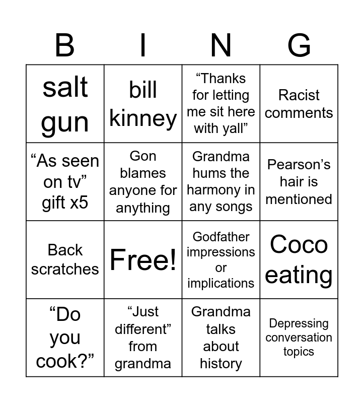 This bingo card has 18 words: Free!, Depressing conversation topics, “Thanks for letting me sit here with yall”, salt gun, Godfather impressions or implications, Racist comments, “Do you cook?”, bill kinney, Pearson’s hair is mentioned, Back scratches, Grandma talks about history, “As seen on tv” gift x5, Coco eating, Gon blames anyone for anything, Grandma hums the harmony in any songs, grandma saying “ok” at the wrong time, “Just different” from grandma and Coco comes to say hello.