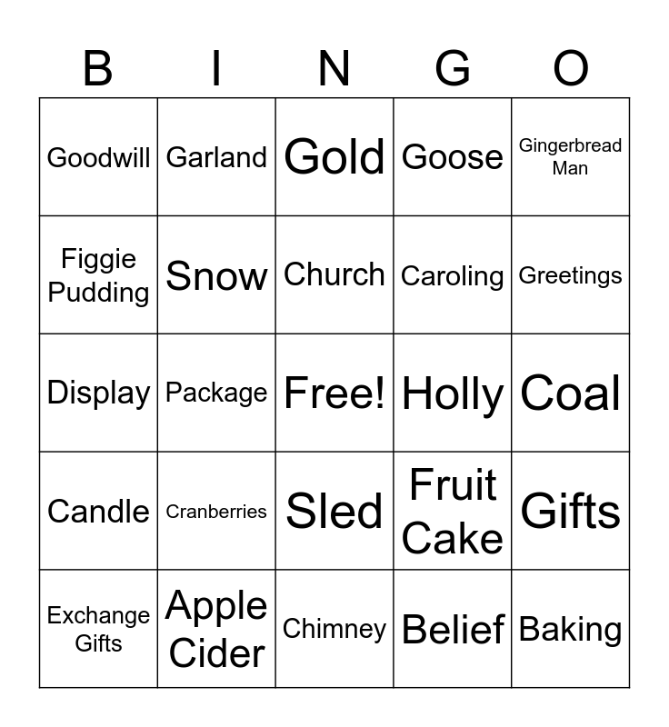 This bingo card has a free space and 24 words: Cranberries, Apple Cider, Church, Exchange Gifts, Gingerbread Man, Goodwill, Figgie Pudding, Garland, Holly, Sled, Caroling, Display, Fruit Cake, Gifts, Snow, Belief, Coal, Gold, Greetings, Package, Baking, Candle, Goose and Chimney.